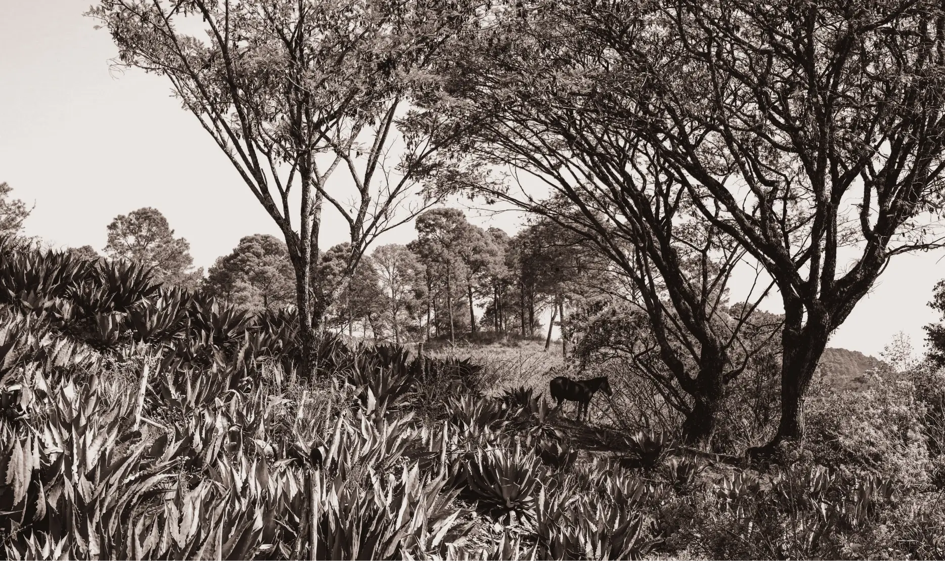Once cooked, the softened agave is crushed with a wooden mallet and canoe. Fibres and juices are ground together to create a rich, fibrous mash that carries both the sweetness of roasted agave and the depth of the earth it grew in.